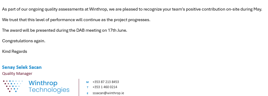 Congratulations to the whole FRA1 team in Germany for not one but two awards for the month of May – “Contractor of the Month” for health and safety and “Quality of the Month”. This has been a fantastic team effort but a special mention to Ionut for managing the H&S and Jagadeesh and the background support from our Engineering Team in the UK, for the Quality award.